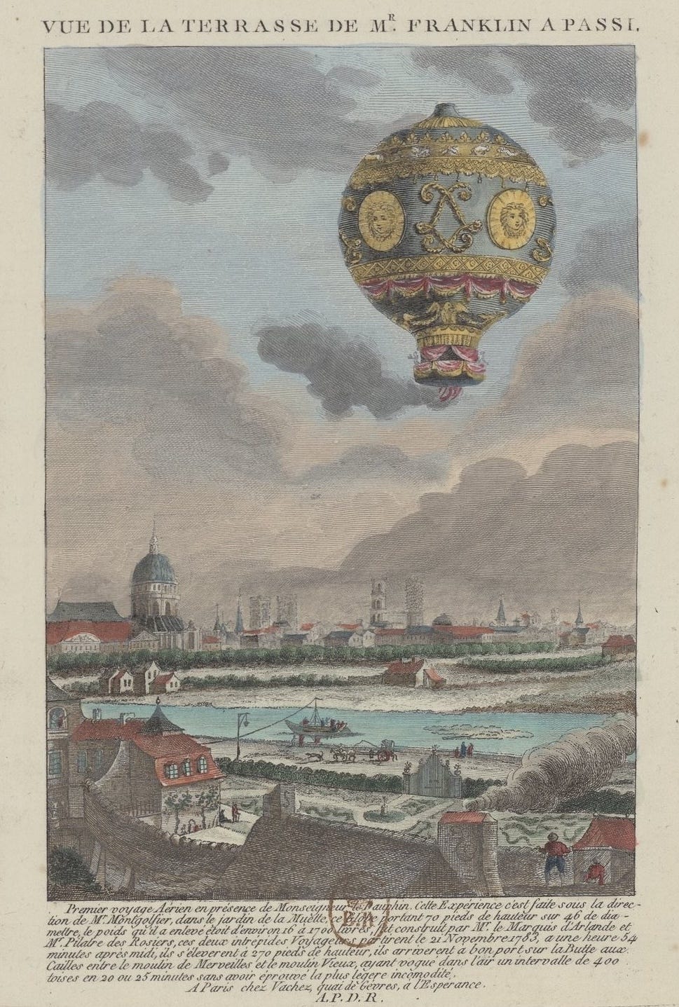 One of these courageous philosophers, the Marquis [François Laurent le Vieux] d’Arlandes [(the other being Jean-François Pilâtre de Rozier)], did me the honor to call upon me in the evening after the experiment with Mr. Montgolfier, the very ingenious inventor. I was happy to see him safe. He informed me they lit gently without the least shock, and the balloon was very little damaged. [They reached a height of 3000 feet, traveled some five miles, and were aloft for 25 minutes.]